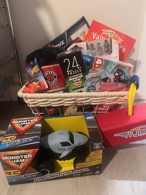 His love basket this year included a few monster trucks, a monster truck puzzle, a Toronto Raptors blanket, gummy hearts, a remote-control car, Lego, Nerf guns, Valentine’s books and crafts, and a red foam Pogo stick that squeaks every time you jump on it.