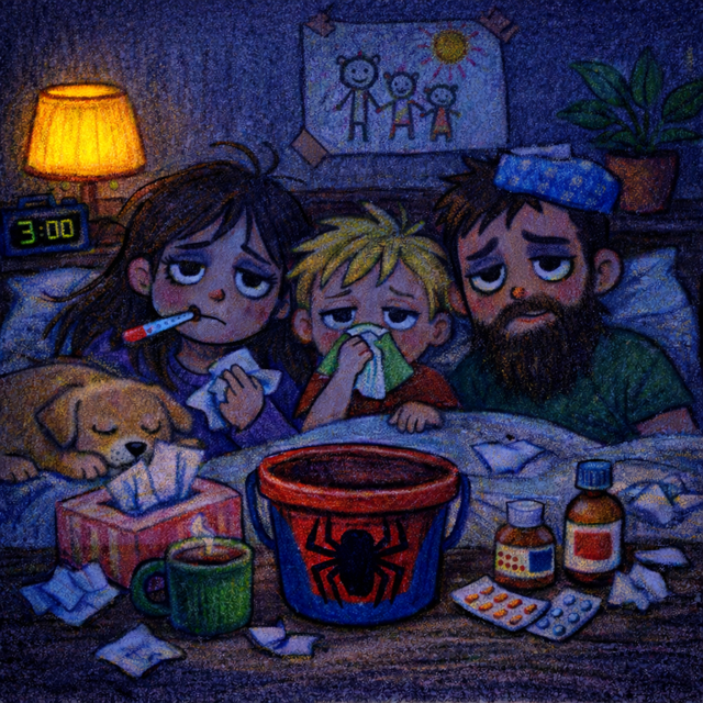 Somewhere between the chaos, the exhaustion, and that poor Spider-man bucket, I realized…we didn’t just get the flu, we survived it. Barely.